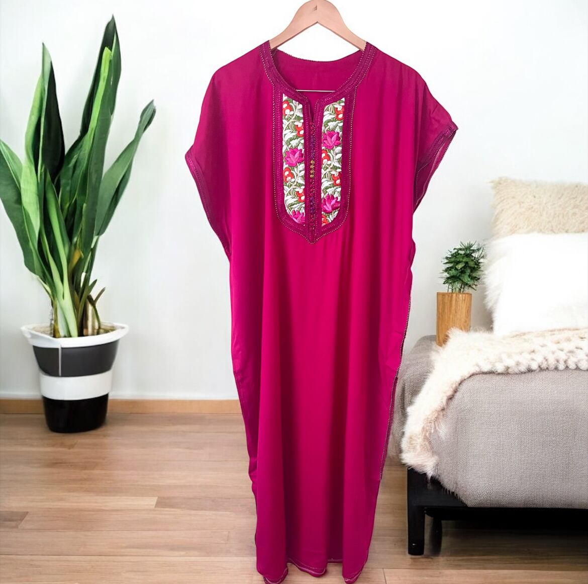 モロッコの伝統的なデザインを取り入れたこのガラベーヤは、軽やかな生地とモロッコ独特のボタンと刺繍が特徴。