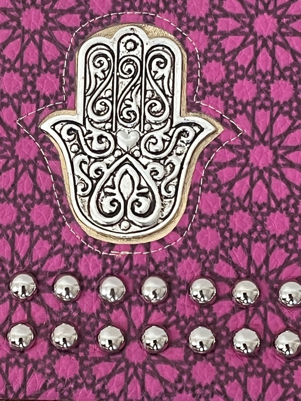 表面にはハミサと呼ばれる手の形のモチーフとスタッズが施され、