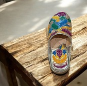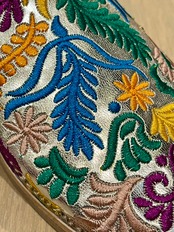 カラフルなリーフの刺繍がポイントで、足元からエスニックな雰囲気を演出します。