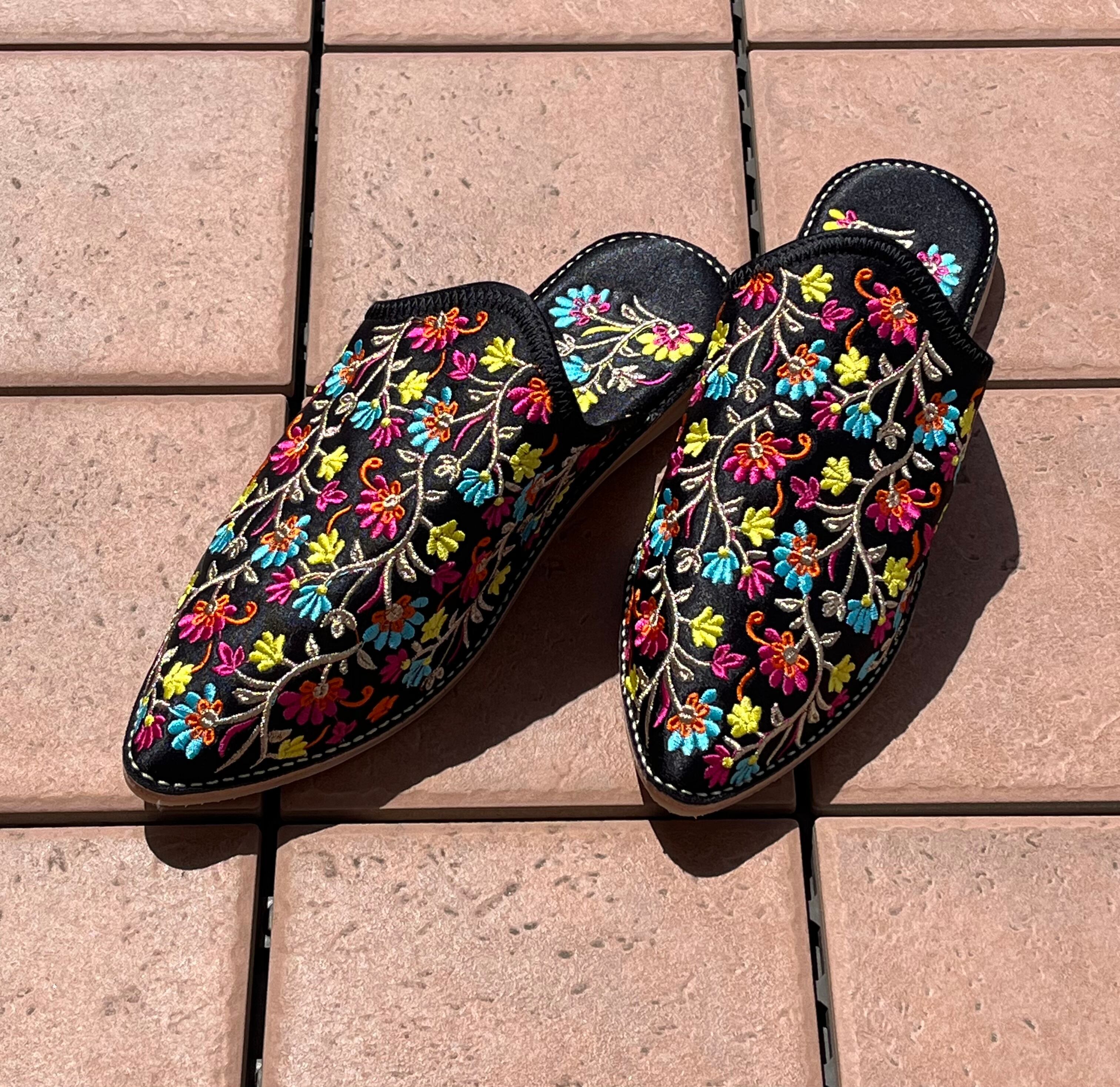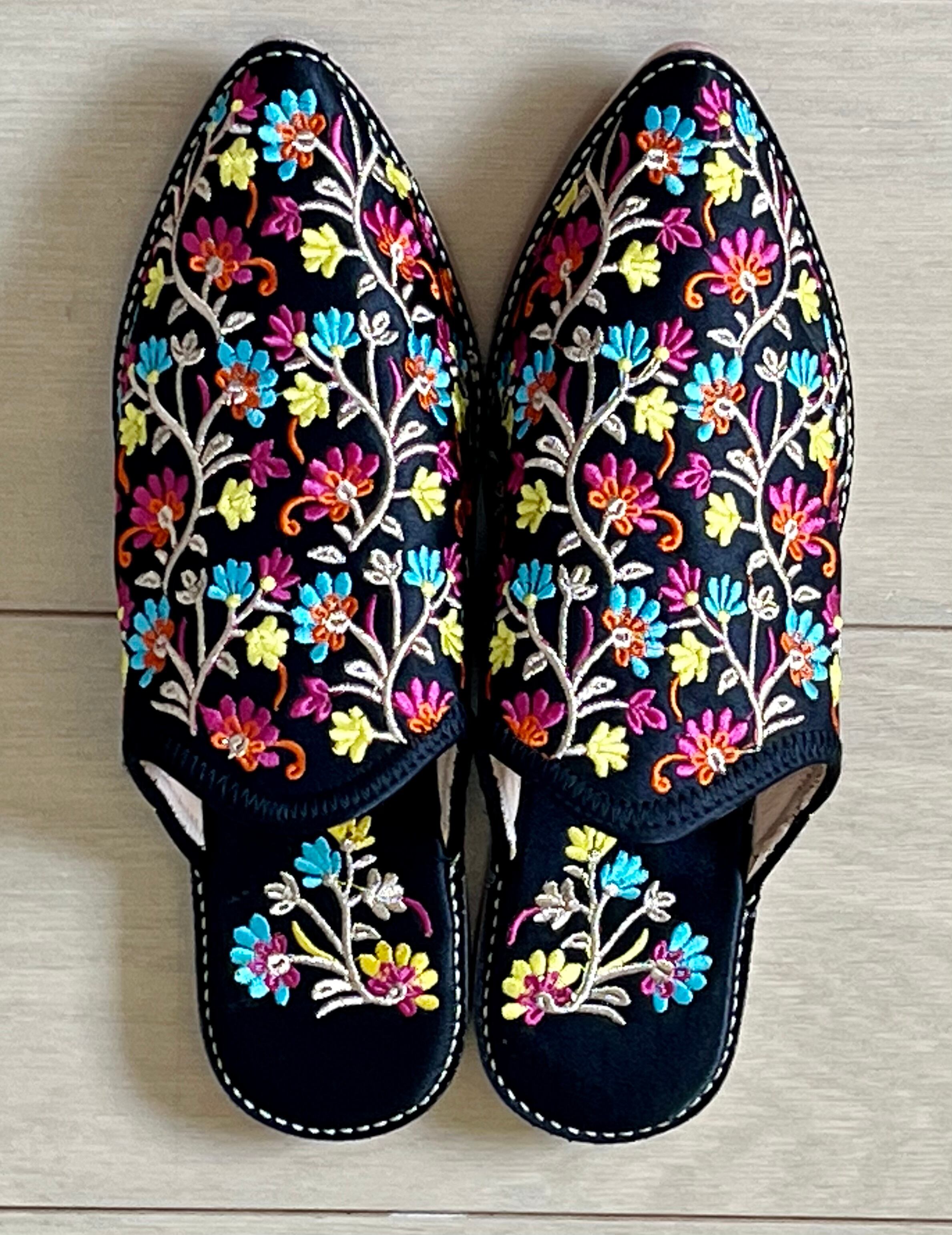 黒地に施されたカラフルな刺繍が目を引く一足です。